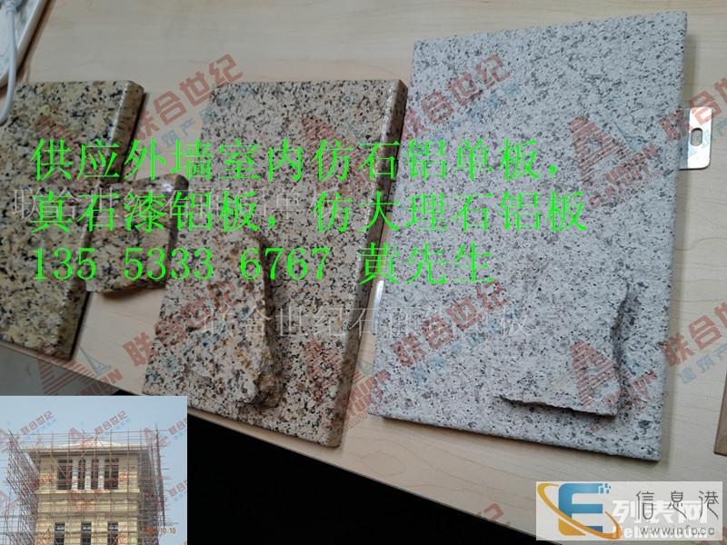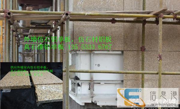 仿石铝单板是一种装饰效果酷似大理石、花岗石。主要采用各种颜色的天然石粉配制而成。真石漆铝单板装修后的建筑物,具有天然真实的自然色泽,给人以高雅、和谐、庄重之美感。适合于各类建筑物的室内外装修。特别是在曲面建筑物上装饰,可以收到生动逼真,回归自然的功效。真石漆具有防火、防水、耐酸碱、耐污染。无毒、无味、粘接力强,永不褪色等特点,能有效地阻止外界恶劣环境对建筑物侵蚀,延长建筑物的寿命,由于真石漆具备良好的附着力和耐冻融性能,因此特别适合在寒冷地区使用。真石漆施工简便,易干省时,施工方便等优点。仿石铝板的优势铝合金板材超强的造型能力与天然石材独具的豪华稳重、端庄艺术的艺术效果相结合,使得仿石铝板具备以下优势:轻质安全仿石铝板采用优质铝合金作为基材,表面涂装以天然花岗石碎粒、优质硅丙乳胶液和铝板专用弹性助剂制备的漆膜。自重轻、不会改变墙体负重的力学状况,不论安装还是使用,都非常安全和轻便。施工简便仿石铝由工厂预制装配幕墙构件,现场只需采用金属幕墙通用的干挂施工即可完成,施工过程比石材更加安全和简便,施工周期更比干挂石材缩短不止一倍。造型丰富仿石铝板基材铝合金板所具有的易加工性能和天然花岗石碎漆膜涂层所具有的丰富选择性,能够轻易制造出天然石材所难以完成的各种复杂造型,最大限度的满足了建筑及造型的需要,能充分体现设计的创意,帮助设计师们更好的表达设计理念。造价经济仿石铝板的材料成本、安装造价和翻新费用之间低、是天然石材所望尘莫及的、大大减低了业主的经济负担。根据外墙饰面砖工程及验收规程JGJ的有关规定,水泥基粘结材料符合现行业标准陶瓷墙地砖胶粘剂JC/T547的技术要求并应按现行行业标准建筑工程饰面砖粘结强度检验标准JGJ110的规定,在实验室进行制样检验粘结强度不得小于0.6MPa。并且明确要求不得采用有机物作为主要粘结材料。仿石铝板仿石层的粘结强度达到3.7MPa为仿石面层的安全性能提供了绝对保证。